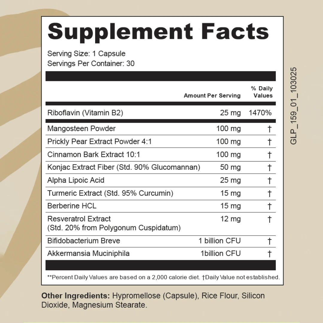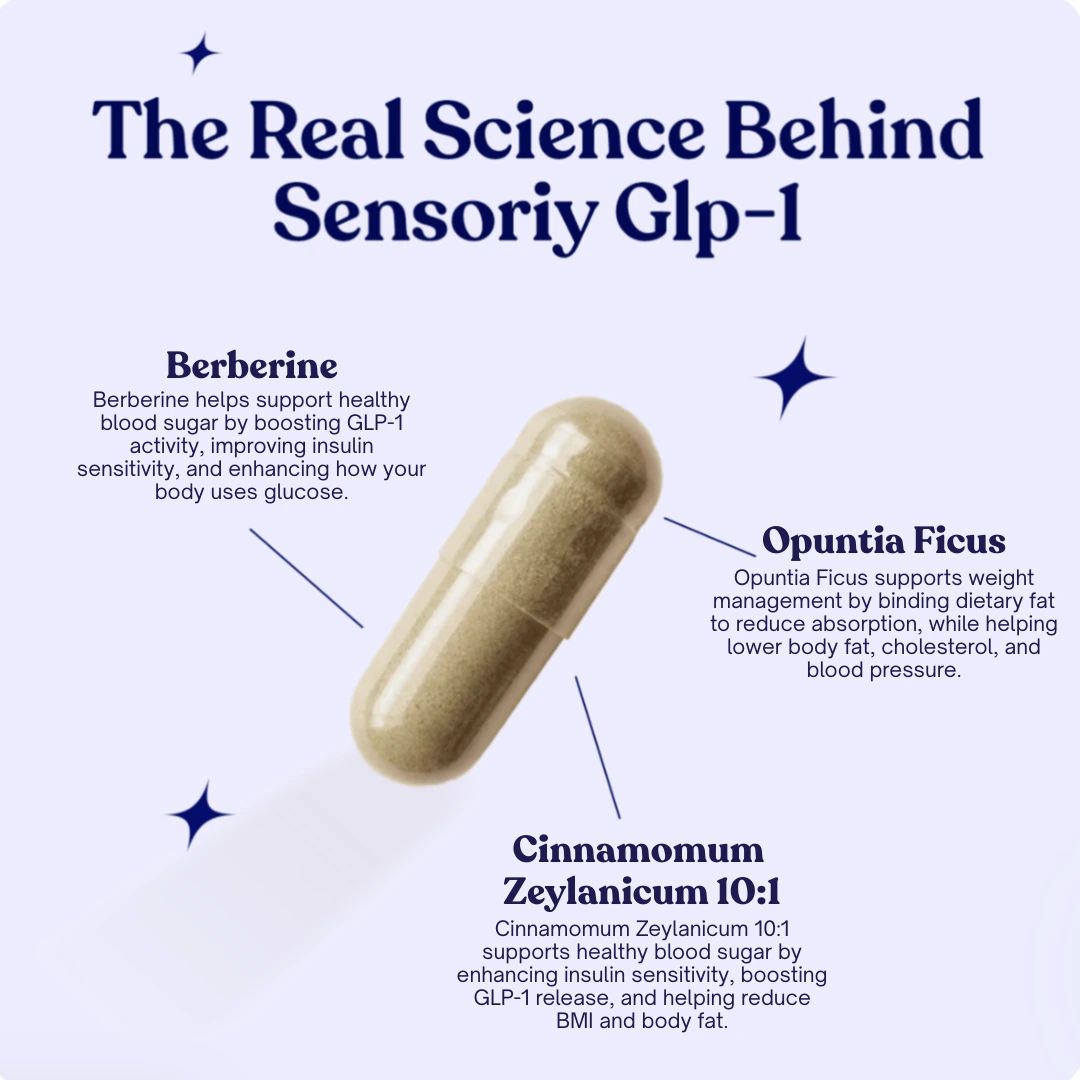 Sensoriy GLP-1 Blend contains Berberine. It is being studied for its ability to stimulate GLP-1 production by activating AMPK, modulating the microbiota (which activates the production of saturated fatty acids that facilitate GLP-1 production) and inhibiting DPP-4 (an enzyme that breaks down GLP-1). Berberine also helps to maintain normal blood sugar levels by promoting insulin sensitivity, reducing glucose production by the liver and stimulating its use by cells.